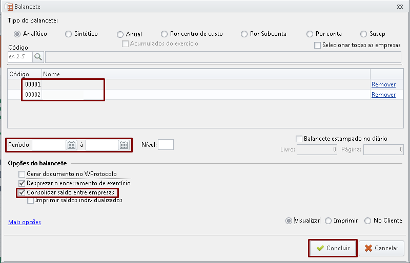 - Selecione mais de uma empresa para que os saldos das contas sejam apresentados de maneira consolidada