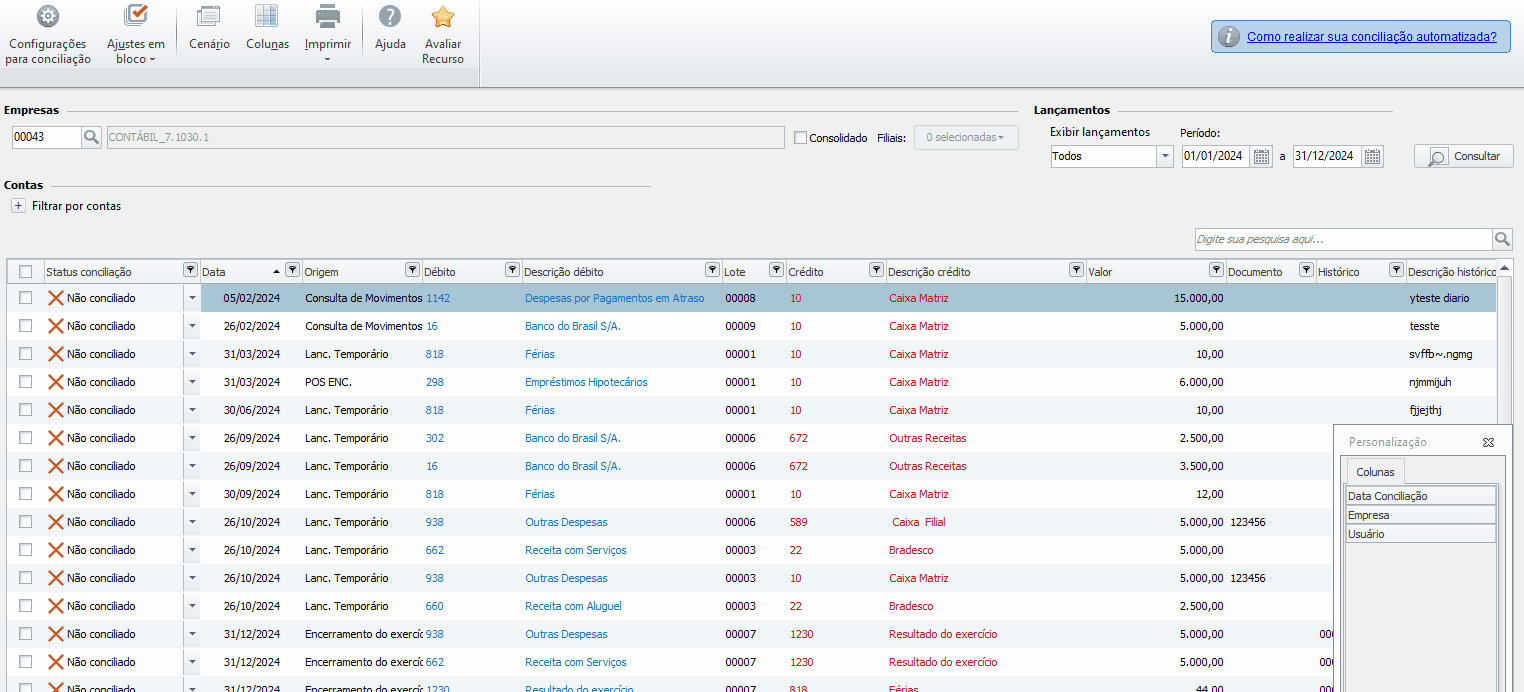 A ferramenta Concilia Fácil permite filtrar seus lançamentos consolidando dados da matriz e das filiais. Para realizar uma consulta consolidada, siga os passos abaixo: