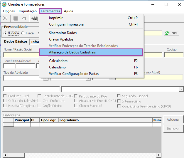 - Clique em Ferramentas e selecione Alteração de Dados Cadastrais