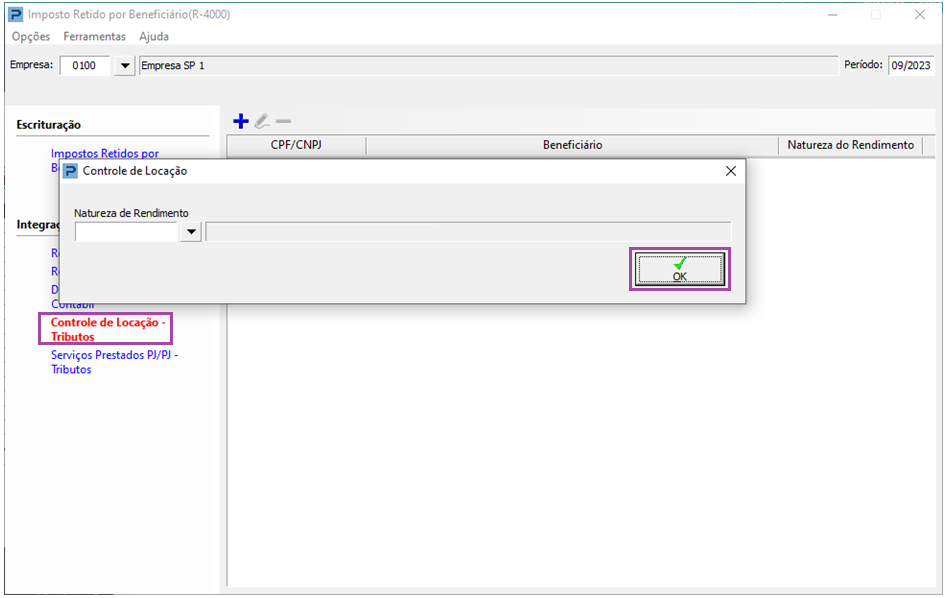 4- Clique em “Controle de Locação - Tributos”, informe a Natureza de Rendimento referente a movimentação e clique em OK. Quando for a 1ª vez o campo da Natureza de Rendimento virá em branco, uma vez informado, toda vez que for gerar a integração, o Sistema irá sugerir a última Natureza de Rendimento informada, podendo alterar ou não.