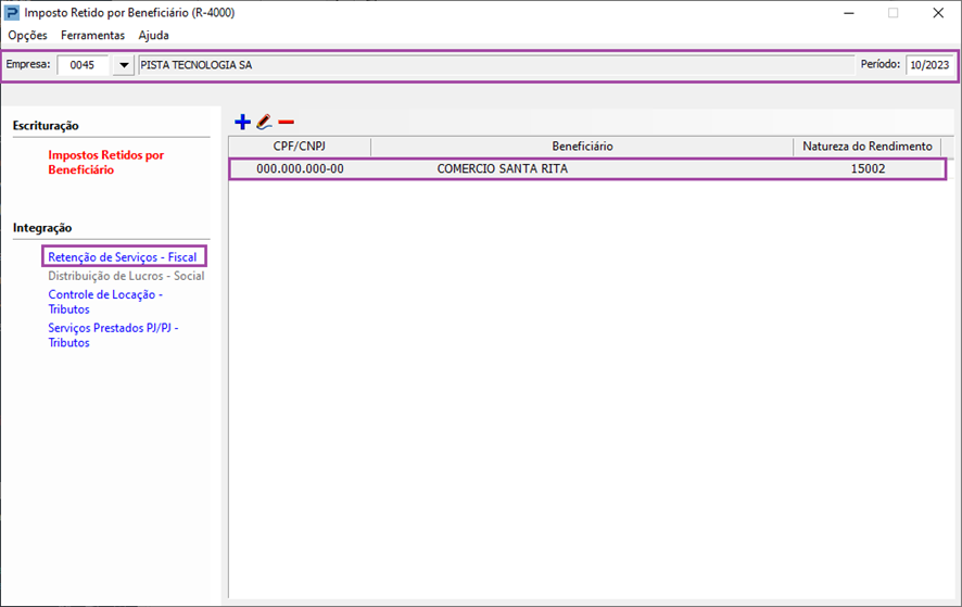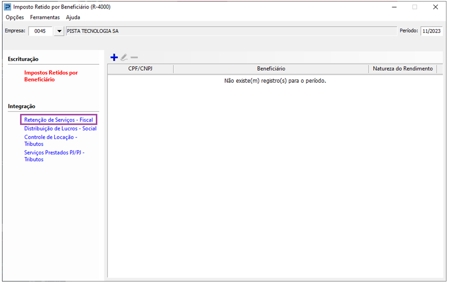 Além da digitação dos valores para a geração da série R-4000, o Sistema também realiza a integração das retenções fiscais, referente a notas escrituradas.