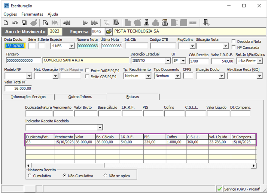 Importante: Pode haver notas de saídas ou serviços prestados (Modelo 51 ou 53 Prosoft). Neste caso deve se utilizar o grupo 2 de Natureza de Rendimento de auto-retenção.
