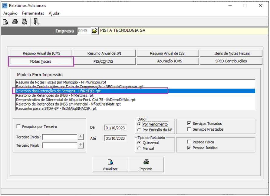 É possível realizar conferências dos valores retidos escriturados em Notas Fiscais > Relatórios das Retenções de Serviços - LfsRelPjPj.rpt