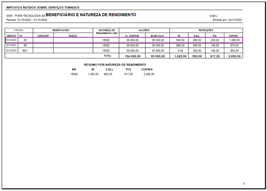 O sistema irá ler todas as notas que possuem retenção tanto para Pessoa Física como para Pessoa Jurídica, irá identificar os serviços das notas e sua a Natureza de Rendimento e se a fatura está baixada para o período.