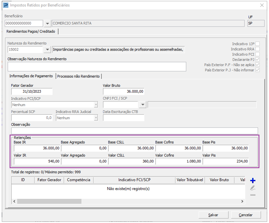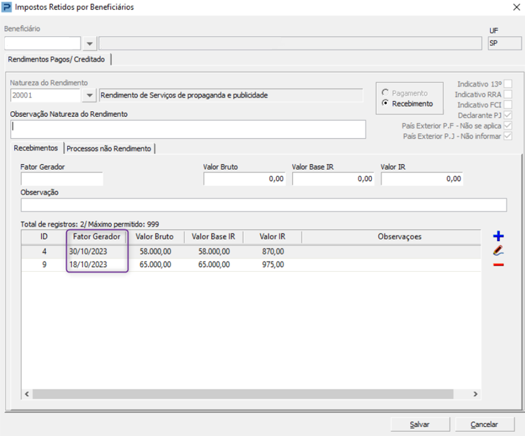 Lembrando que o cadastro não permite o mesmo Beneficiário e Natureza de Rendimento no mesmo período. Caso haja essa situação, o Sistema irá unificar os valores em um lançamento na Integração.