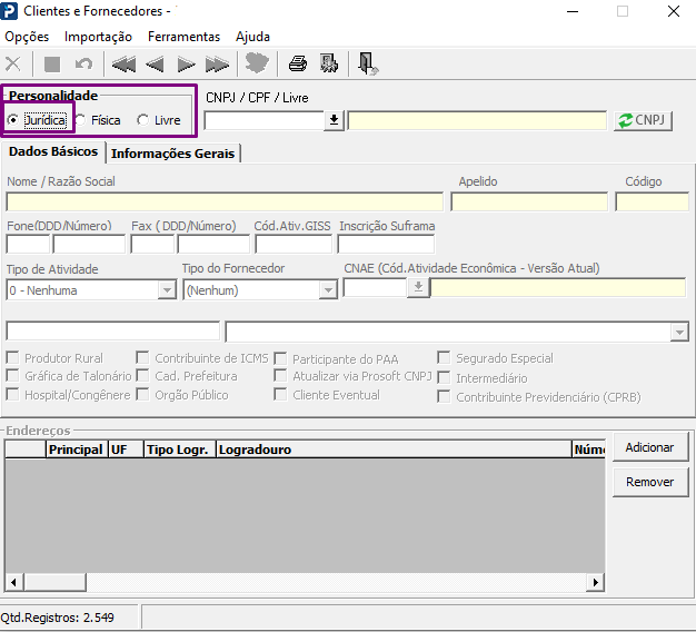 CNPJ - O campo Personalidade precisa estar marcado como Jurídica
