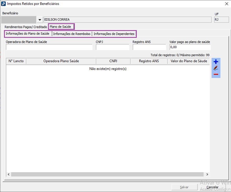 Observação: Para acessar a aba de Informações de Reembolso ou Dependentes, é necessário cadastrar primeiro o Plano de Saúde e descer as informações no grid (+)