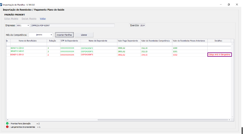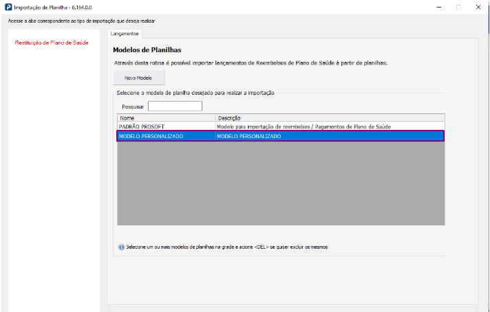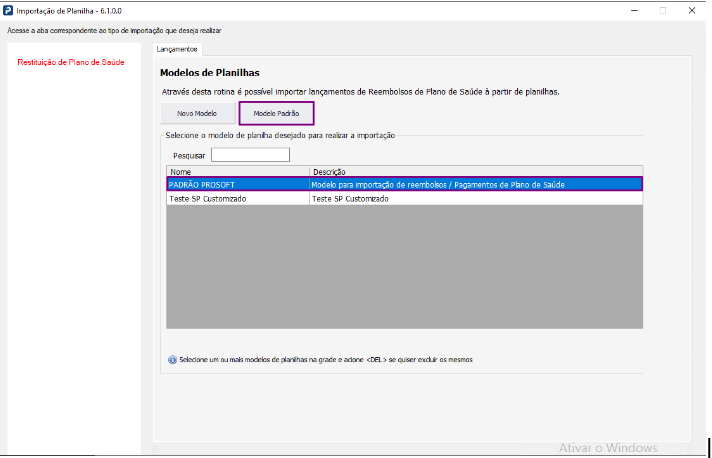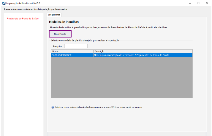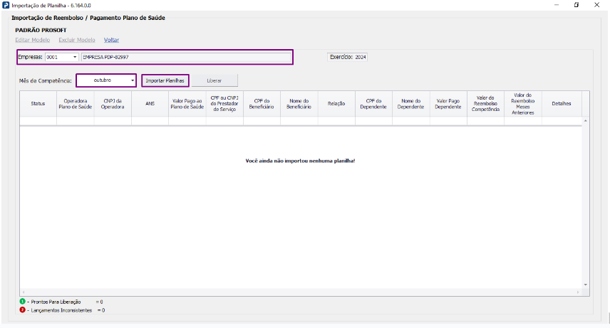 Importação de Planilha (Modelo Padrão ProsoftAcesse: Fiscal > Documentos Entradas e Saídas > Importação de Planilha > Restituição de Plano de Saúde