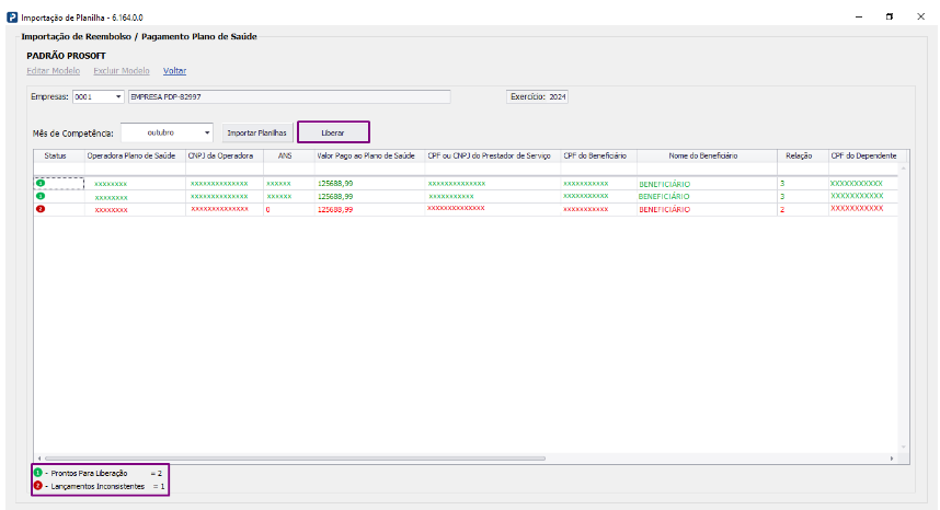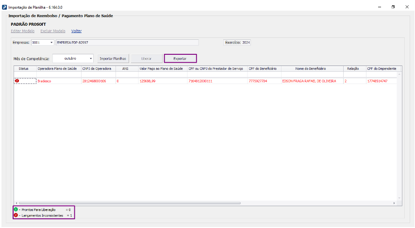 3.2- Os lançamentos na cor vermelha são os lançamentos com inconsistências. Após a liberação dos arquivos prontos para liberação, será habilitado o botão Exportar. Será gerada uma nova planilha para ajuste dos lançamentos inconsistentes.