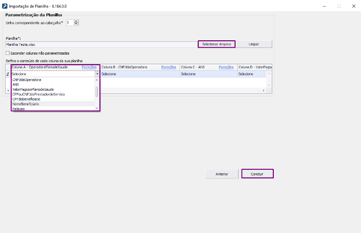6- Faça o De Para das colunas, informando qual coluna corresponde a que é solicitada para a configuração do Modelo