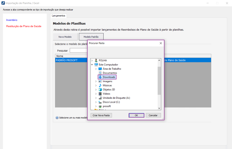 Observação: Ao clicar no botão Modelo Padrão, será aberta uma tela para que seja feita a seleção da pasta onde o arquivo deverá ser salvo: