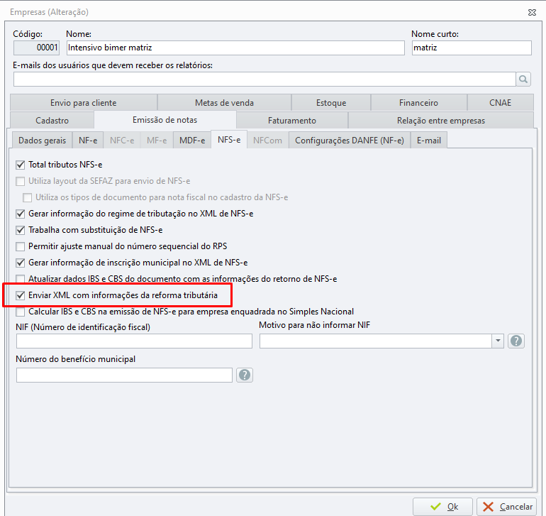 Localize e marque a opção: "Enviar XML com informações da reforma tributária".