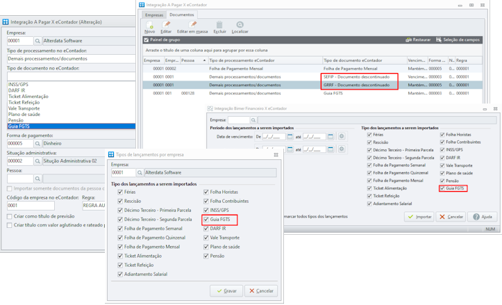 | Financeiro | FIN23274 | Melhoria | Ótimas notícias! Agora o processo de integração entre o Bimer Financeiro e o eContador foi aprimorado para acompanhar o novo padrão de geração de documentos! Agora, você deve configurar a Guia FGTS para importação no lugar dos documentos SEFIP e GRRF. O Que Mudou? Os documentos SEFIP e GRRF foram descontinuados e foram substituídos por um novo documento unificado, chamado Guia FGTS. Por que Mudou? Essa mudança foi feita para compatibilizar o sistema com os novos padrões de documentos gerados em versões atualizadas do processamento, garantindo que a importação ocorra sempre de forma correta e segura. O Que Preciso Fazer de Diferente? Nas configurações de integração, você não verá mais as opções SEFIP e GRRF. Em seu lugar, use a Guia FGTS. Localização das configurações: Configurador > Financeiro > Integrações > Integração eContador > Empresas. Configurador > Financeiro > Integrações > Integração eContador > Documentos. Dentro do integrador IntegracaoBimerFinanceiroeContador. Implementamos essa melhoria para garantir que a sua integração esteja sempre protegida contra a importação de documentos desatualizados. Aproveite essa novidade! | Integração Bimer x eContador |