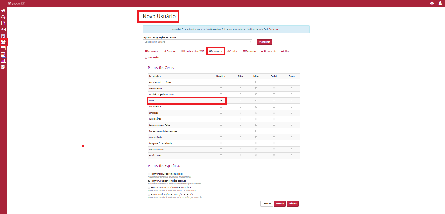 Em Notificações marque a opção 'Collect' para que este usuário receba notificações referentes as informações do collect.