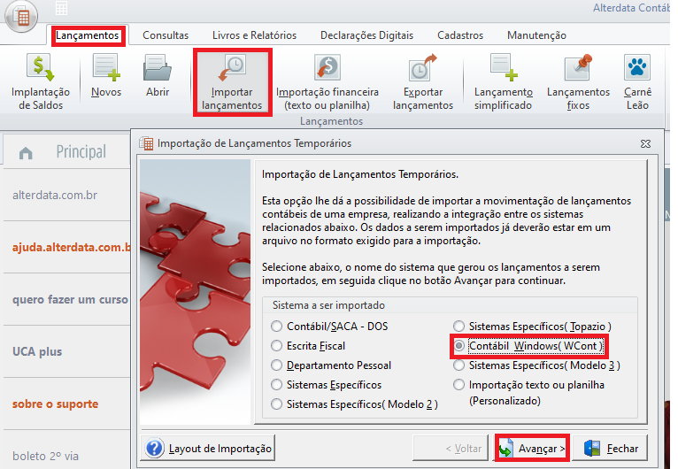 - Para realizar a importação de maneira correta, selecione a opção Contábil Windows (Wcont) e clique em Avançar.