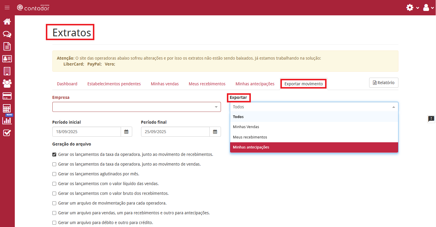 As opções contidas em Geração do Arquivo facilitam para que o usuário não precise gerar o arquivo 3 x selecionando as operadoras uma a uma.- Marque as opções de geração do arquivo de acordo com o que foi selecionado no campo Exportar.