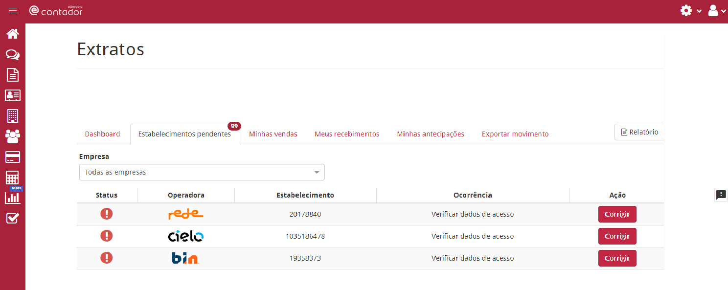 Nesta aba são demonstrados os estabelecimentos que estão com os dados de acesso incorretos.