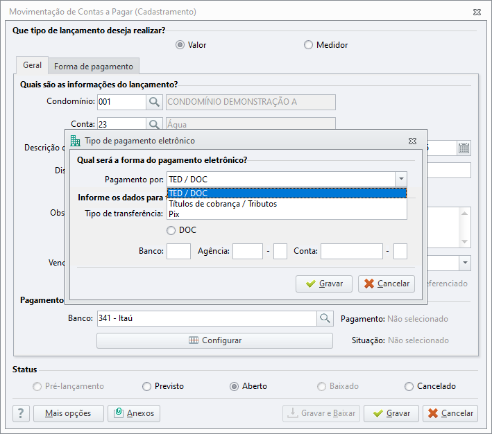 COND-26435/ COND-26526 | Melhoria | Agora é possível realizar pagamentos eletrônicos de contas do Itaú por meio das modalidades TED, TEV e PIX. A geração do arquivo de remessa foi ampliada para contemplar: Novos lançamentos, nas modalidades PIX, TED e TEV; Credores com informações bancárias já cadastradas; Credores sem informações bancárias cadastradas, com possibilidade de preenchimento direto durante a criação do lançamento em Contas a Pagar > Pagamento Eletrônico > Configurar, informando os dados bancários no momento do registro. | alt_immobile_rc, Condomínio |