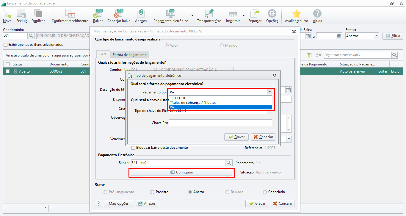 - No lançamento de contas a pagar, na aba Geral no campo Forma de pagamento informe o banco e clique em Configurar.