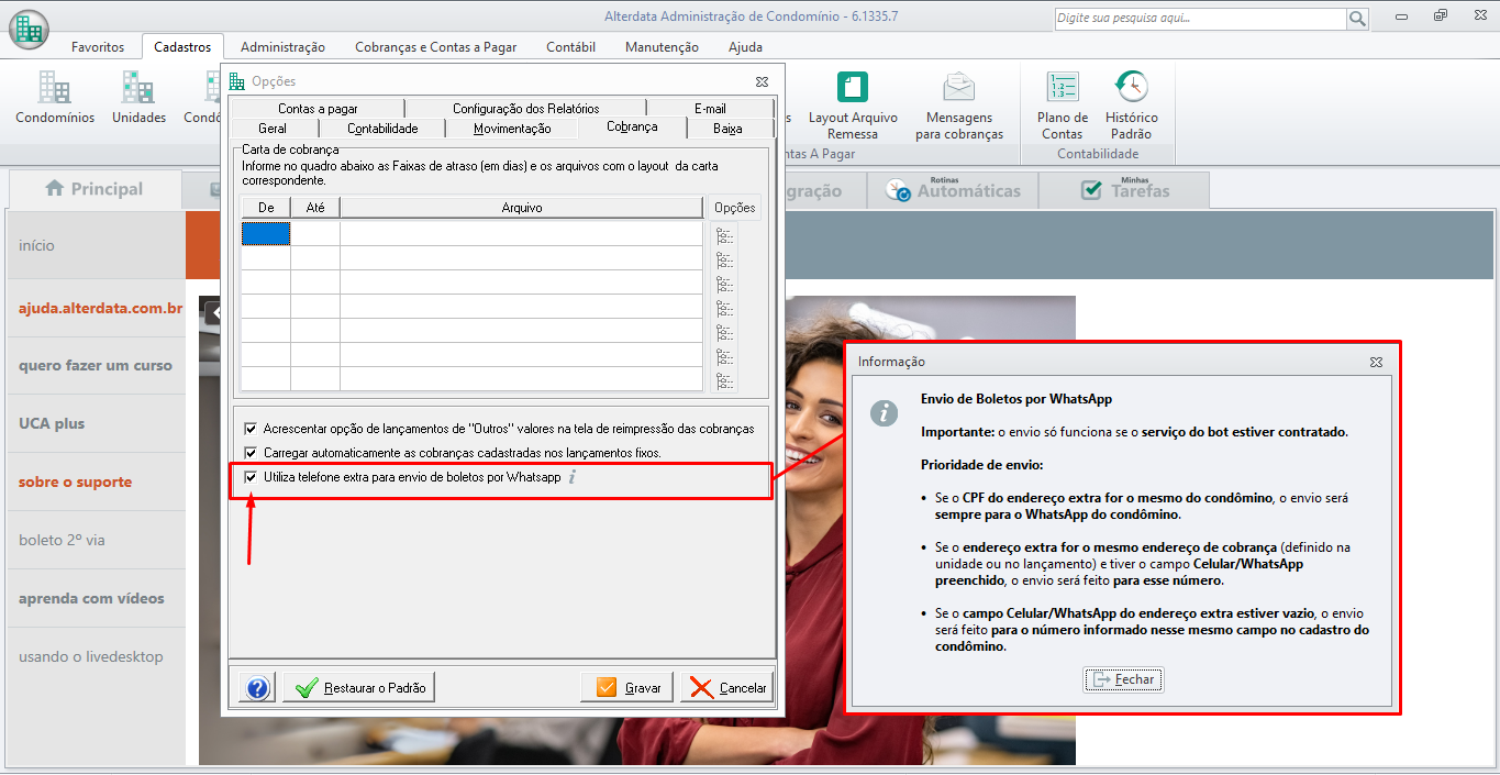 Foi realizado um ajuste na tela Configurações > Opções, seção Cobrança, para garantir que o envio de boletos por WhatsApp ao endereço extra ocorra somente quando a opção correspondente estiver corretamente marcada.