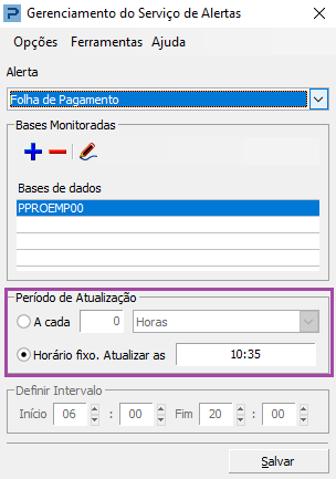 4- Questionar qual o horário que colocou no menu em Configurações > Gerenciamento de Serviços de Alertas, pois será através daquela hora que irá atualizar as informações do painel. Se a PROEMPXX não estiver configurada, a mesma devera ser adicionada.