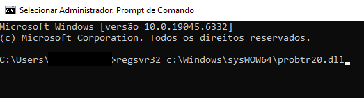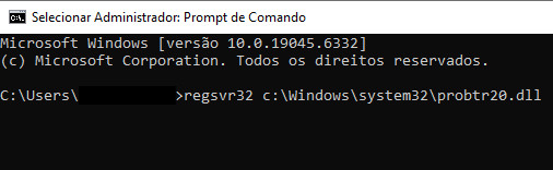 regsvr32 c:\Windows\sysWOW64\probtr20.dll, tecle Enter.
