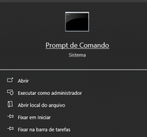 1 - Digite “cmd” no menu pesquisar do Windows, clique com o botão direito do mouse em cima do “Prompt de comando” e selecione: Executar como administrador.