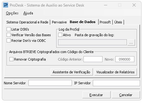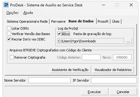 2- Na aba Base de Dados, selecione a opção Recriar DSN’s via ODBC, digite o Nome Servidor e clique em Executar.
