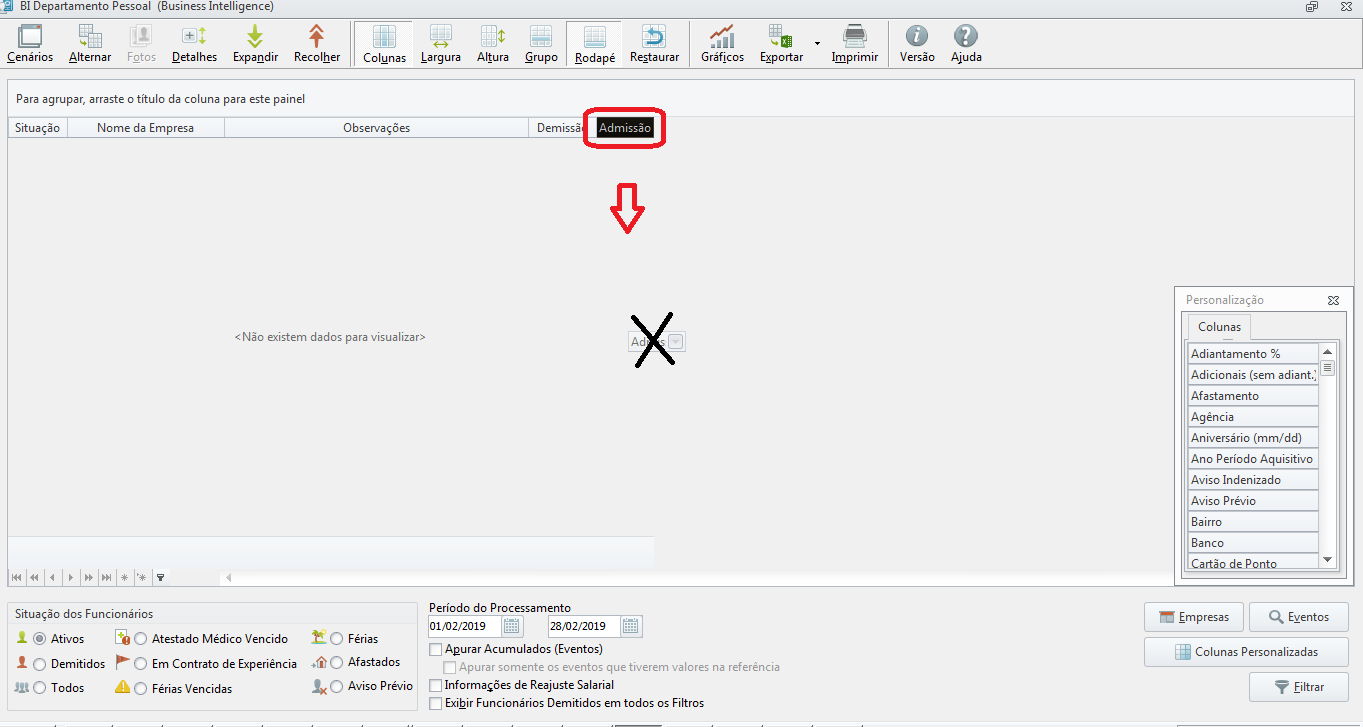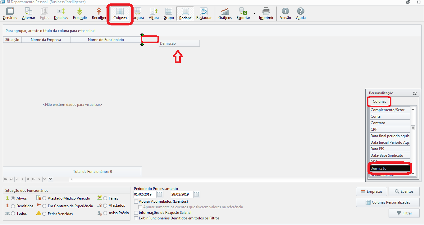 Para incluir uma nova coluna basta selecionar o ícone Colunas e arrastar a opção desejada, neste caso a opção de Demissão.