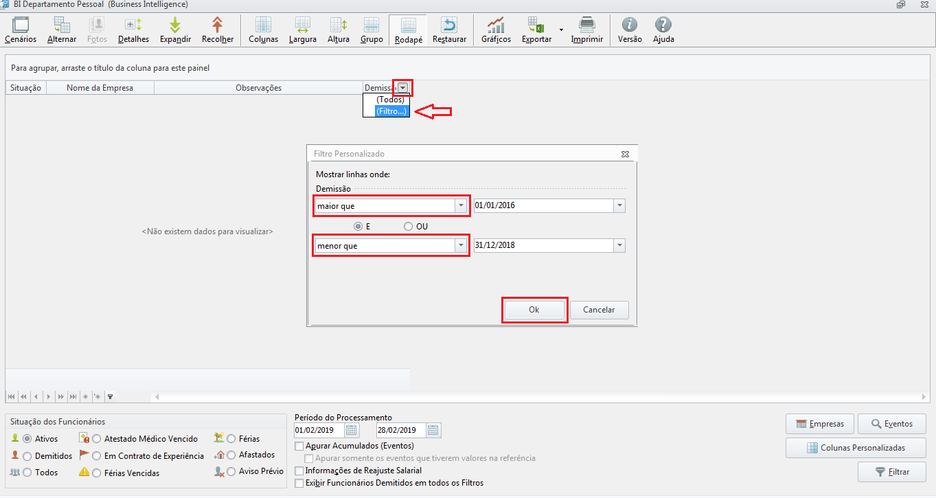 . Informe a empresa desejada e clique em Confirmar; - Deve estar com a opção Todos marcada no campo Situação dos Funcionários e clique em Filtrar;