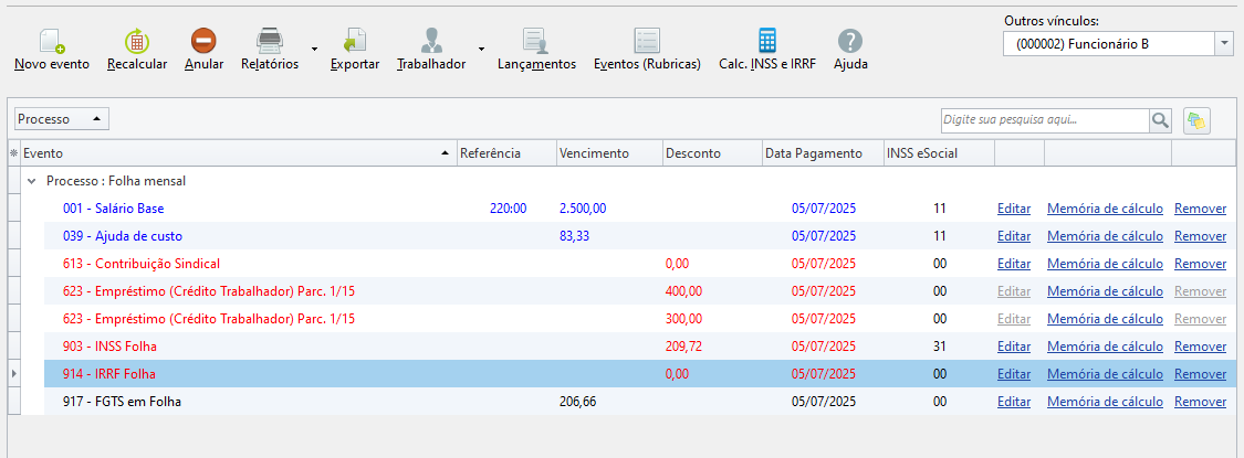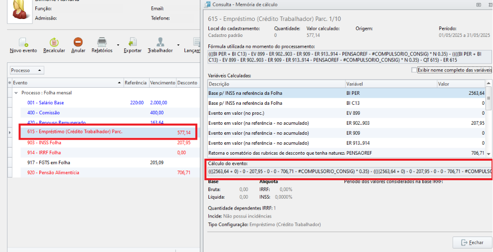 - Seleciona a rubrica de Empréstimo (Crédito Trabalhador) e clique no ícone Memória de cálculo;