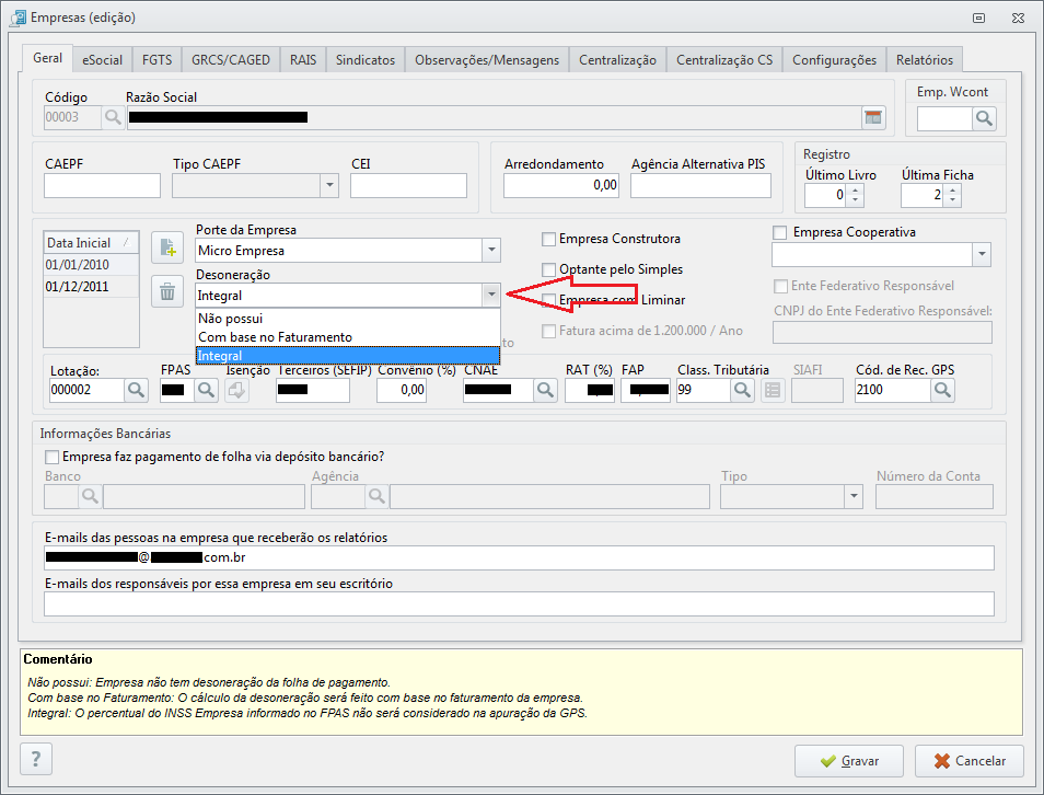 - Após acesse a aba Geral, campo Desoneração, verifique se o tipo de desoneração para este período está correto;