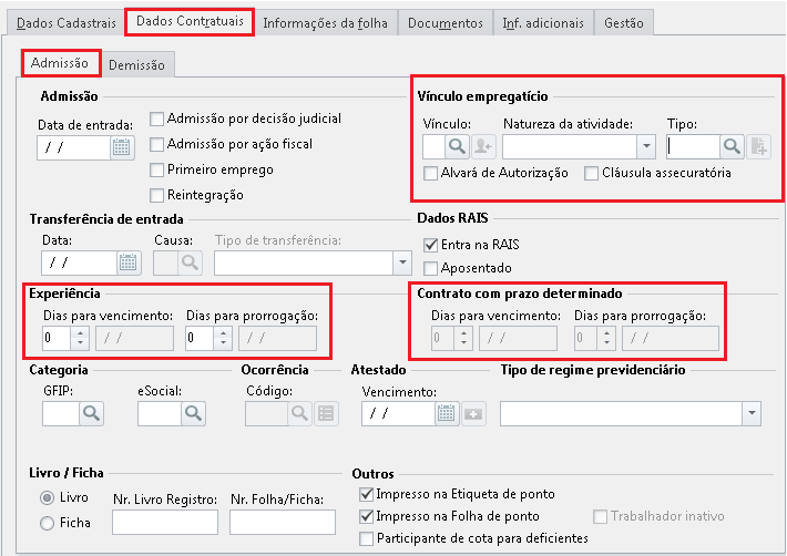 Acessando a aba Dados Contratuais - Admissão verifique o quadro "Vínculo Empregatício";