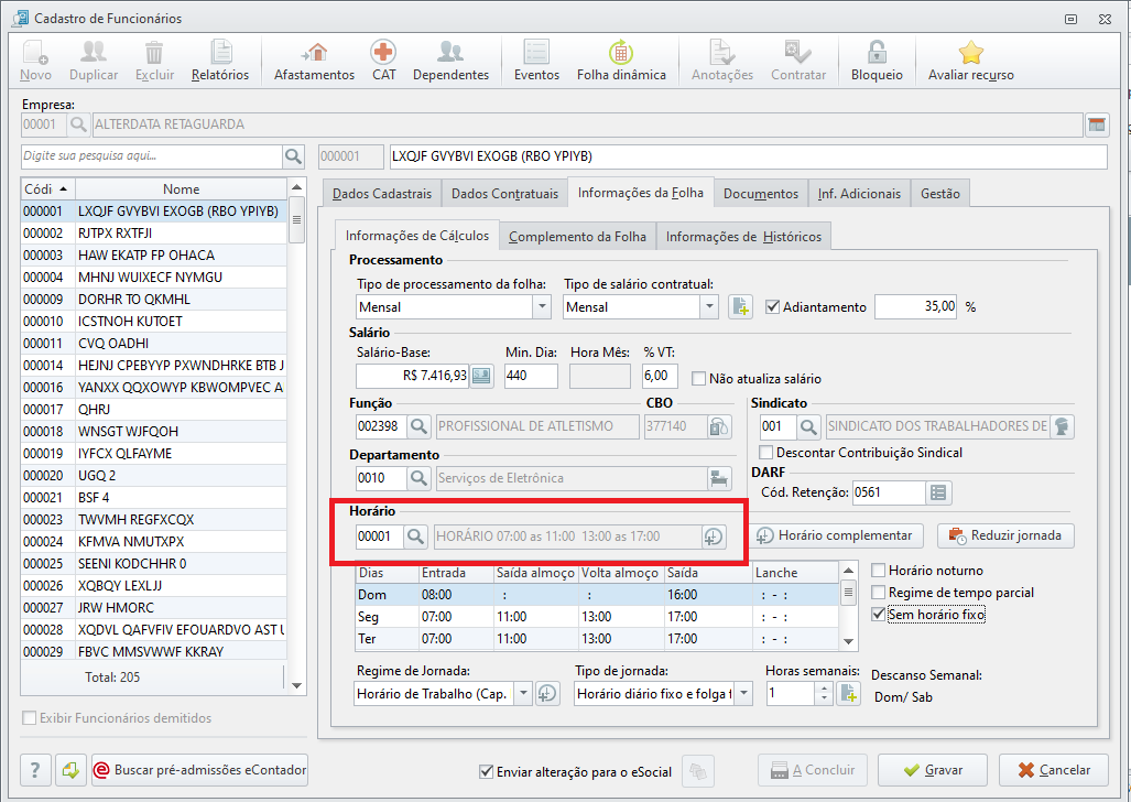 Acesse a aba informações da folha e verifique se esta preenchido o Horário do funcionário.
