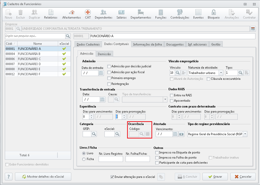 - Acessar a aba Dados Contratuais e informar no campo Ocorrência o código correspondente ou se for indevido a informação deixar em branco o campo;