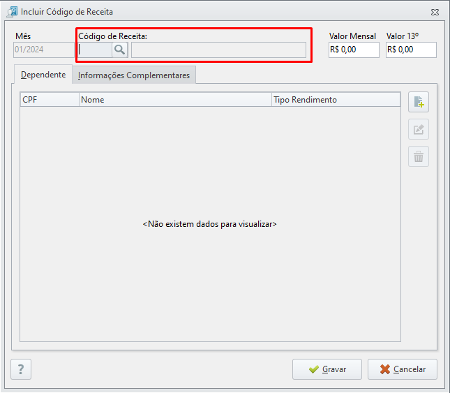 - Clique em Informações de IRRF por código de Receita e informe o código de Receita;