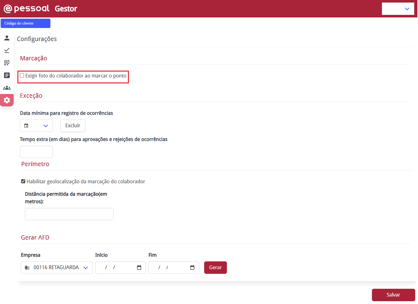 - Exigir foto do colaborador ao marcar o ponto. Ao marcar essa opção, o funcionário deverá tirar a sua foto no momento do registro do ponto;