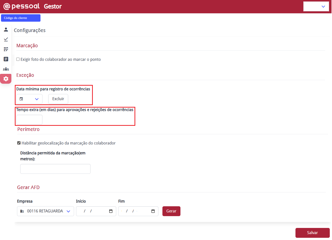 Entre as opções disponíveis, pode ajustar a data mínima para o registro de ocorrências e determinar se o sistema deve exigir foto do colaborador ao marcar o ponto, garantindo mais segurança e controle.