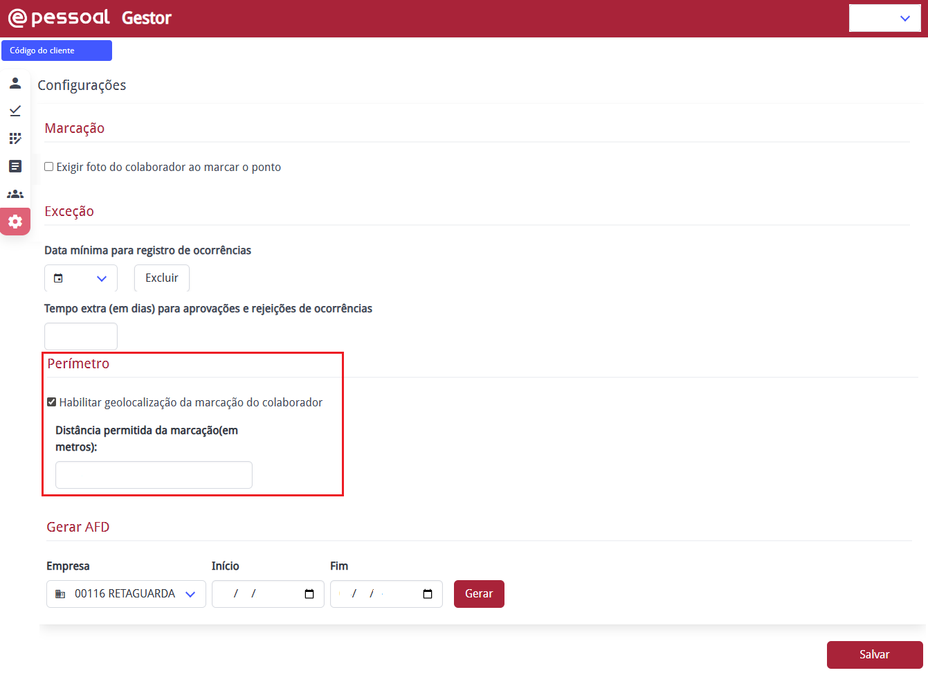 Habilitar geolocalização da marcação do colaborador. Ao marcar essa opção, será habilitado o campo para informar a distância permitida (em metros) da marcação;