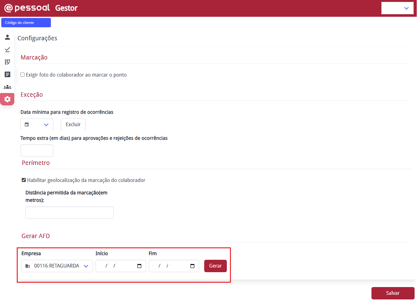- Informe a data de início e fim, para geração do arquivo AFD;