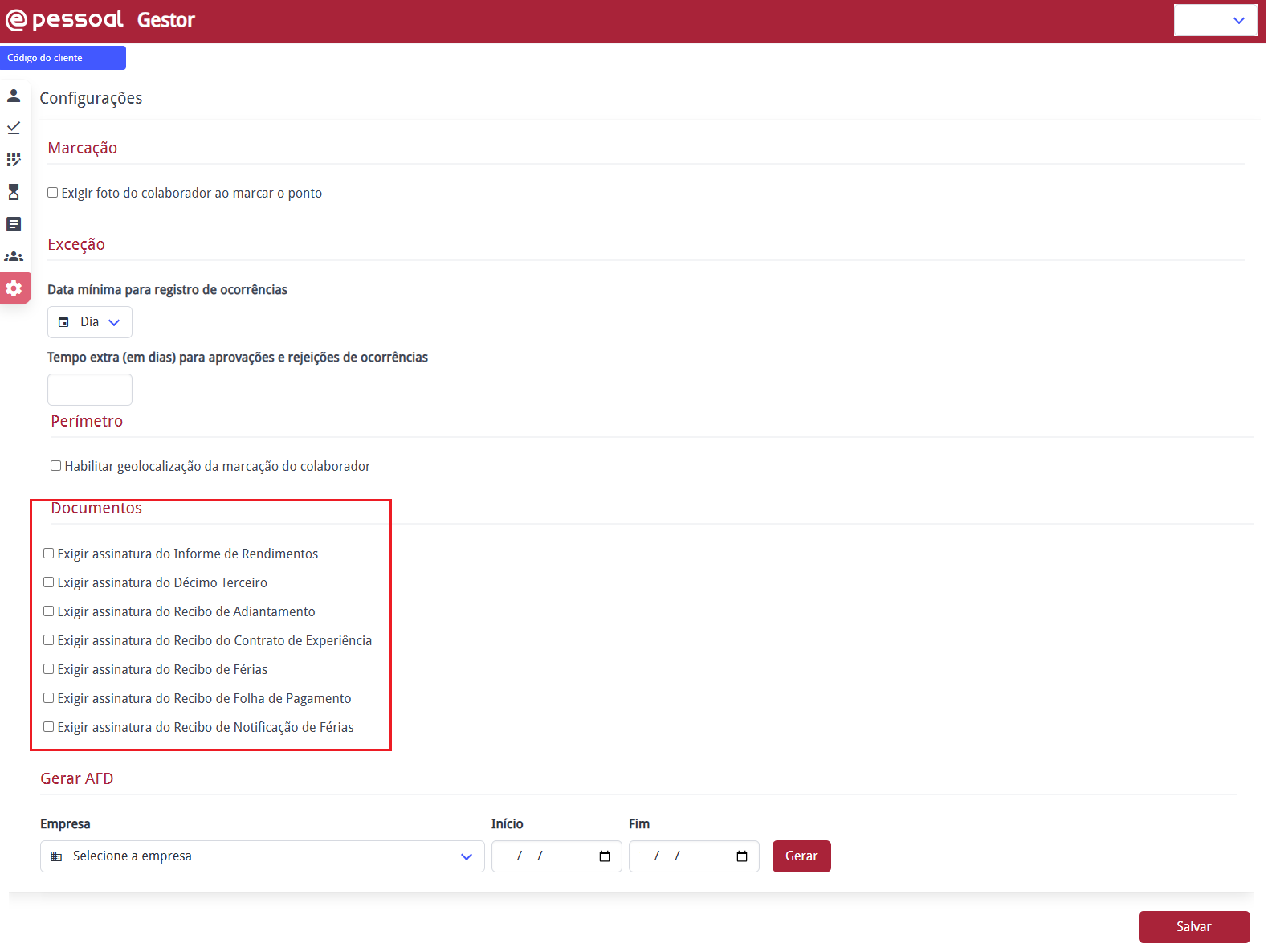 A opção documentos, se refere a configuração de exigência da assinatura nos documentos integrados do sistema Departamento Pessoal.