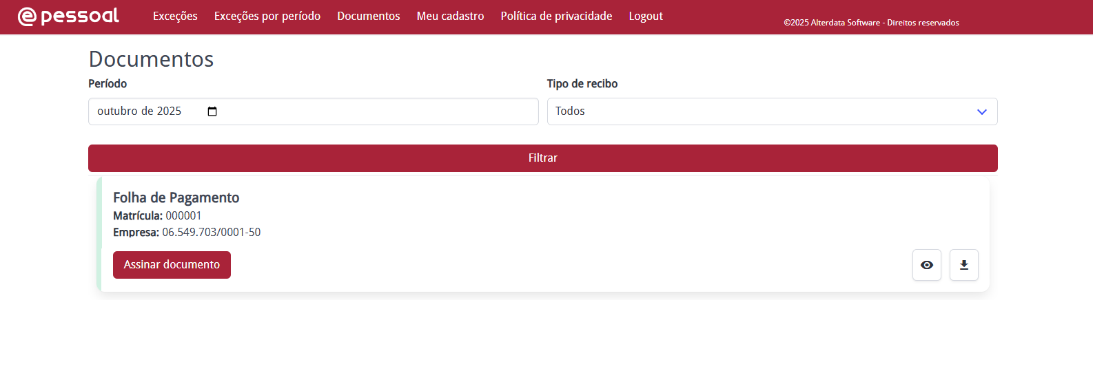 Na aba Documentos, o funcionário possui acesso a todos os recibos e comprovantes.