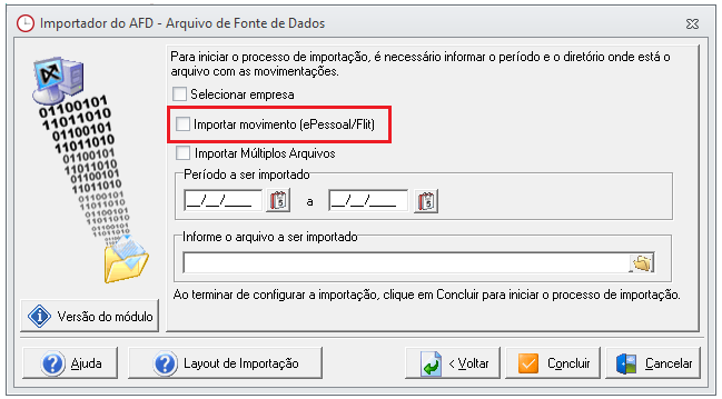 A importação das movimentações é feita de forma automática, caso prefira não esperar que o sistema faça a importação, poderá utilizar a ferramenta do importador AFD.