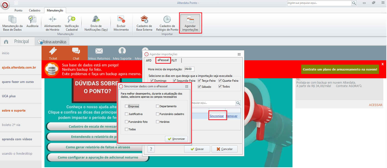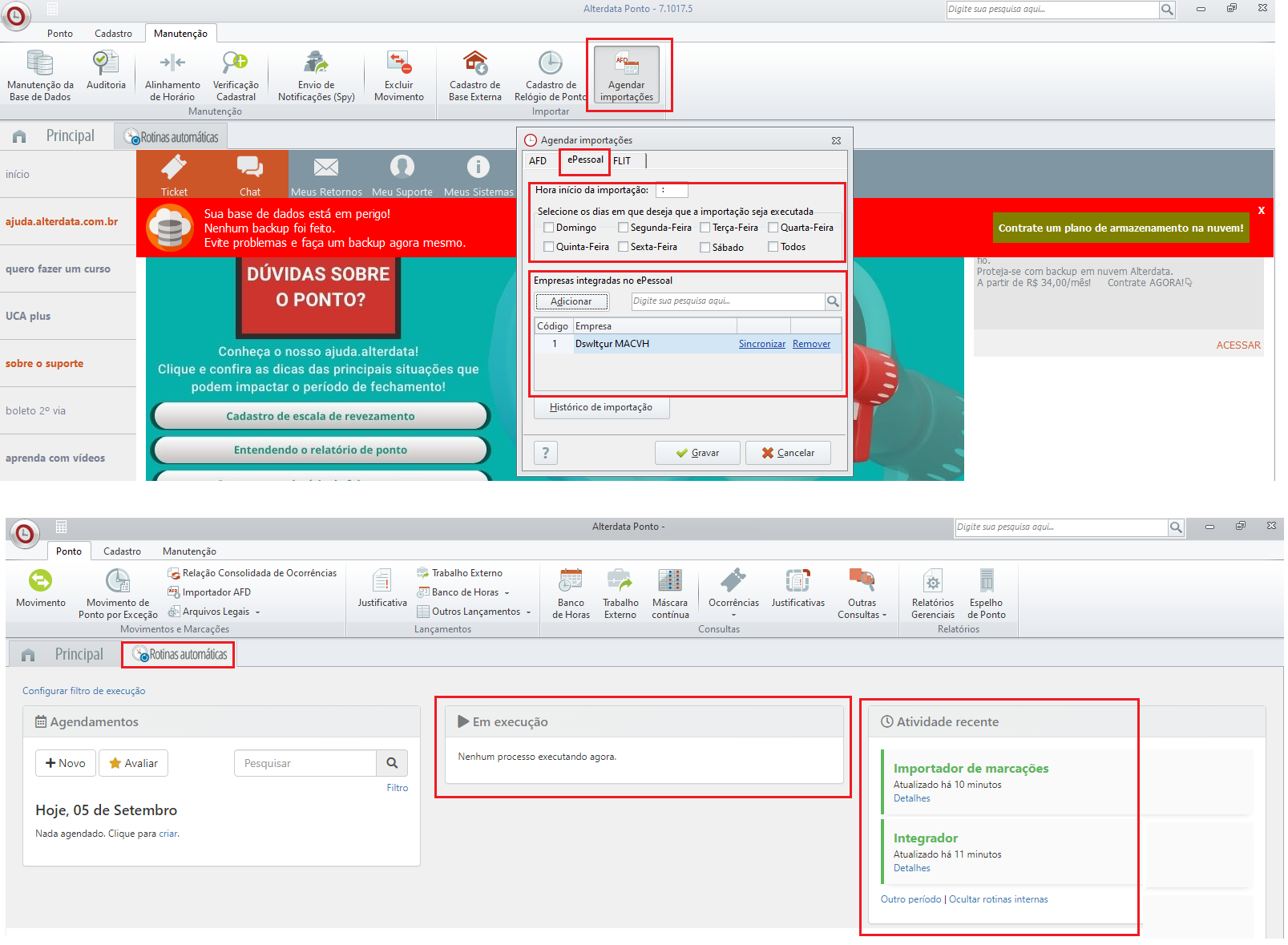 Para devido funcionamento do integrador rotinas automáticas, a empresa deve estar totalmente integrada com o ePessoal, e no sistema de Ponto eletrônico, aba Manutenção, opção Agendar Importações na aba ePessoal é necessário criar agendamento para empresa.