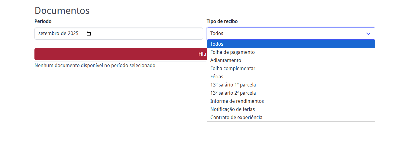 Nesta seção, o funcionário terá acesso a documentos enviados pelo Departamento Pessoal, podendo filtrar por período e tipo de recibo (como folha de pagamento, férias, parcelas do 13º, etc.). Podendo visualizar, baixar e assinar esses mesmos documentos.