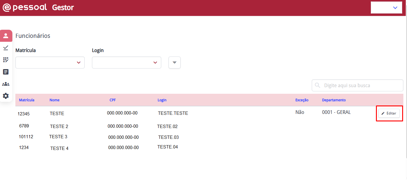 Nessa aba, é possível consultar os funcionários integrados do sistema Ponto Eletrônico, podendo utilizar os filtros de Matrícula ou Login.