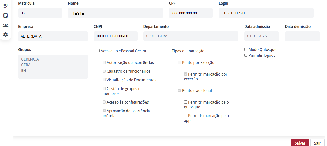 Também, ao clicar em editar, é possível editar as configurações do mesmo, definindo a forma de marcação de ponto e habilitar o acesso Gestor.