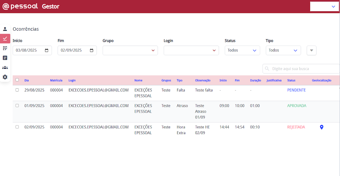 Nesta seção, o Gestor tem uma visão completa e a capacidade de gerenciar as ocorrências de Horas Extras, Faltas e Atrasos dos seus colaboradores que trabalham com Ponto por Exceção, onde poderá aprovar ou não determinada ocorrência.