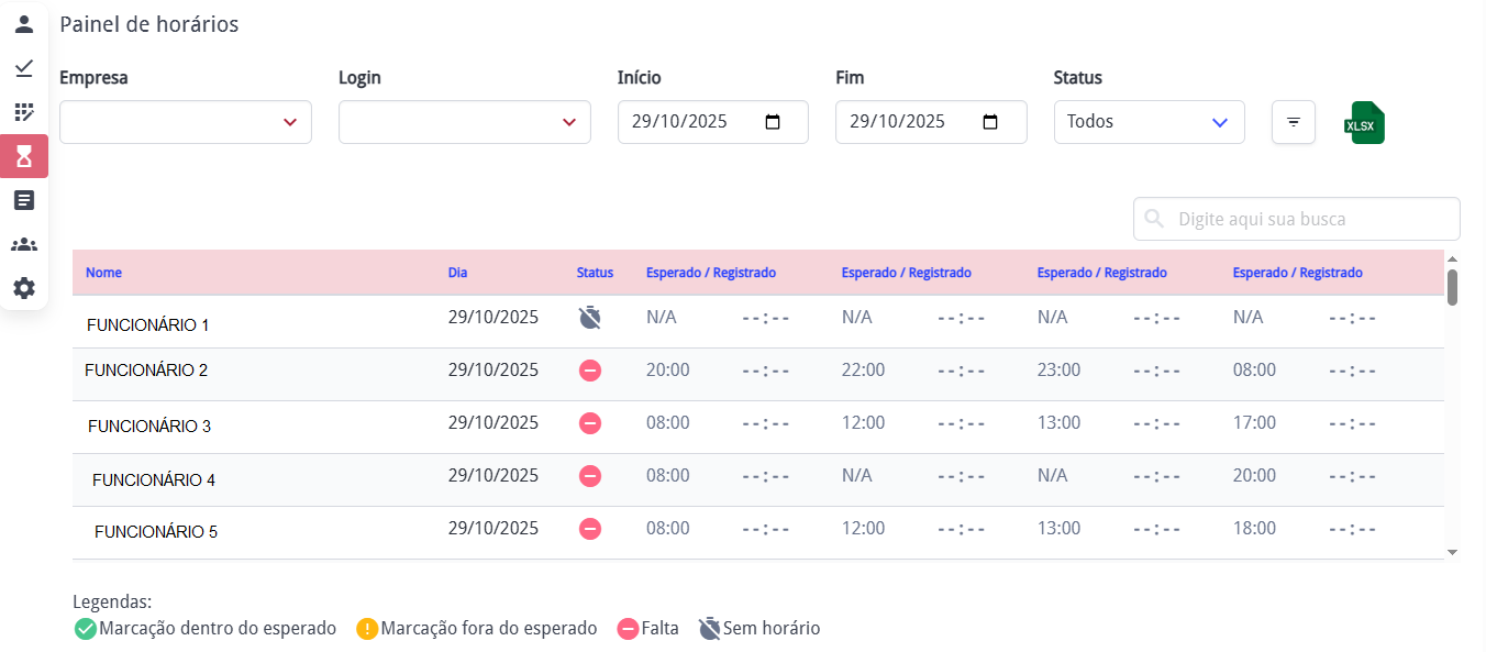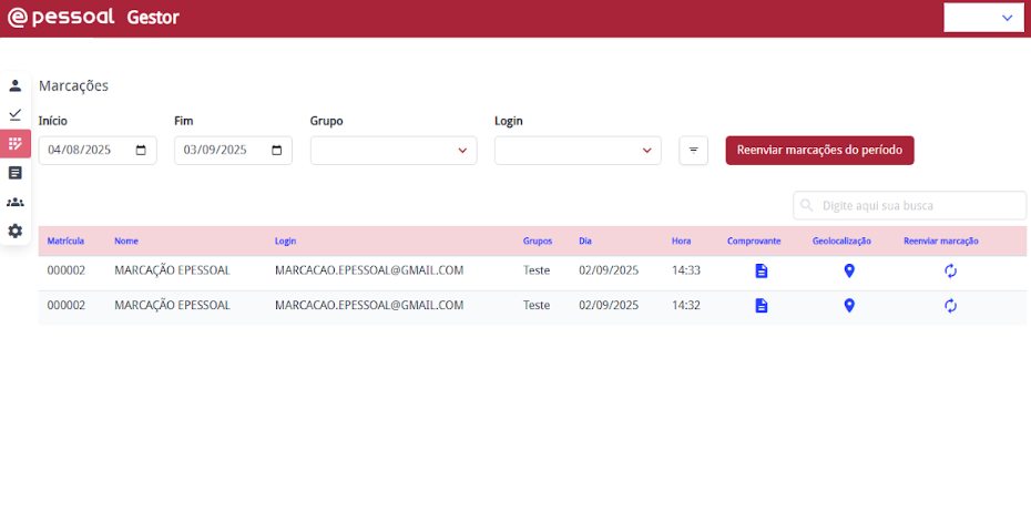 O gestor pode acompanhar quem realizou ou não as marcações dentro do período esperado, filtrando por empresa, login do colaborador, data de início, data de término e status.