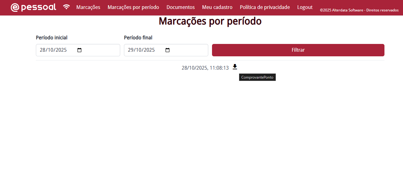 Em Marcações por período, ele acessa e consulta todas as suas marcações e comprovantes. Além disso, pode aplicar filtros de data para obter uma visão detalhada e precisa de suas entradas e saídas em qualquer período.